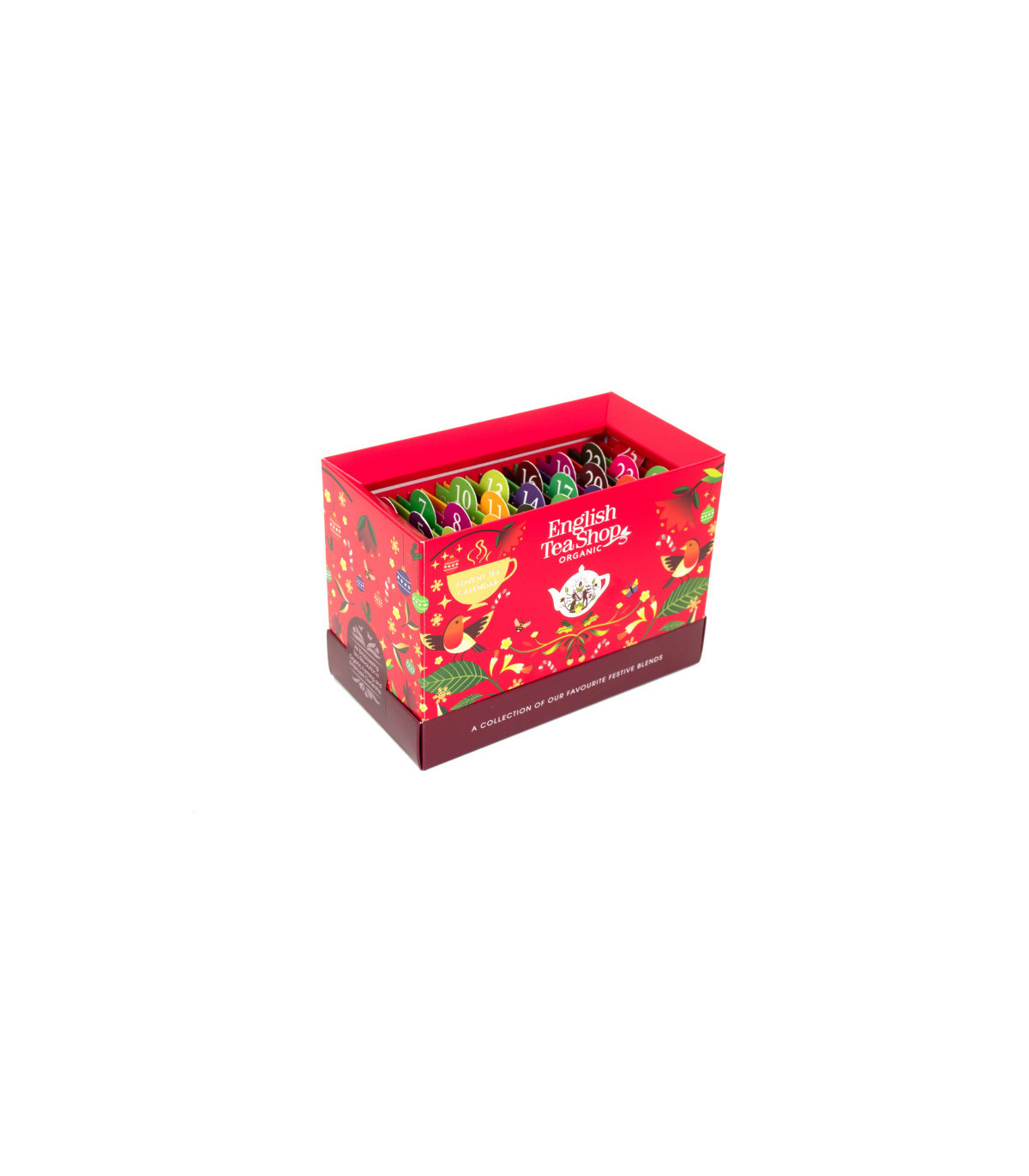 Adventný kalendár obsahuje 25 čajov v bio kvalite. Každý deň si tak môžete spríjemniť kvalitným zeleným, ovocným, čiernym, bylinkovým alebo roiboss čajom v celkovo 13-tich lahodných a nevšedných kombináciách.