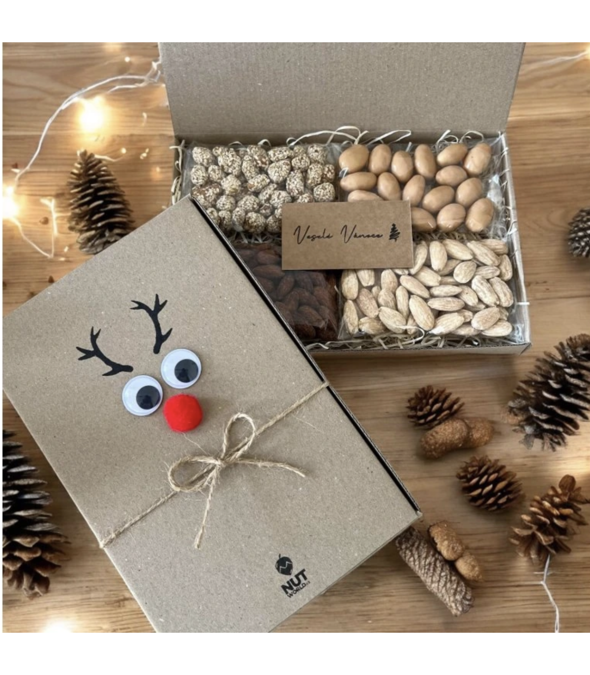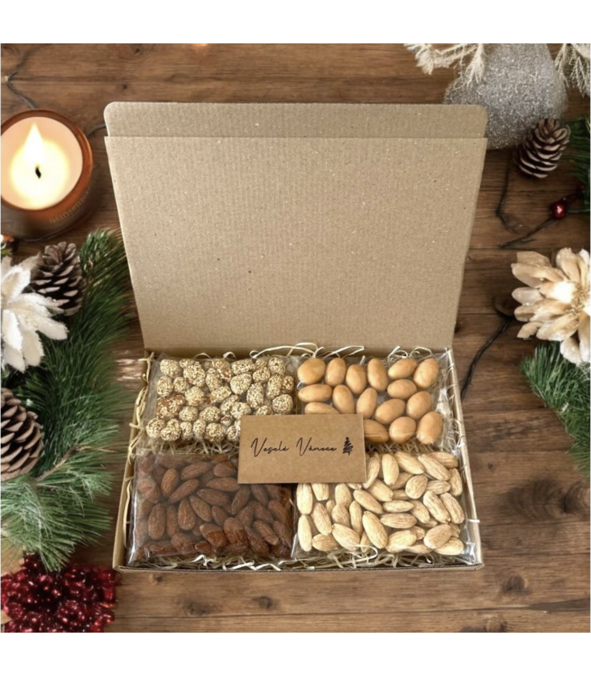 Premýšľate, čím urobiť radosť svojej babičke alebo dedkovi na Vianoce? Máme pre vás jedinečný tip. Táto darčeková súprava obsahuje vynikajúce mandle a arašidy v rôznych chuťových variantoch. Výborná pochutina, ktorá sa perfektne hodí pre spoločne strávený večer pri poháriku vína a rozprávanie sa o živote. Navyše orechy sú veľmi prospešné pre naše zdravie. Akonáhle túto zmes arašidov a mandlí ochutnáte, už nebude môcť prestať.