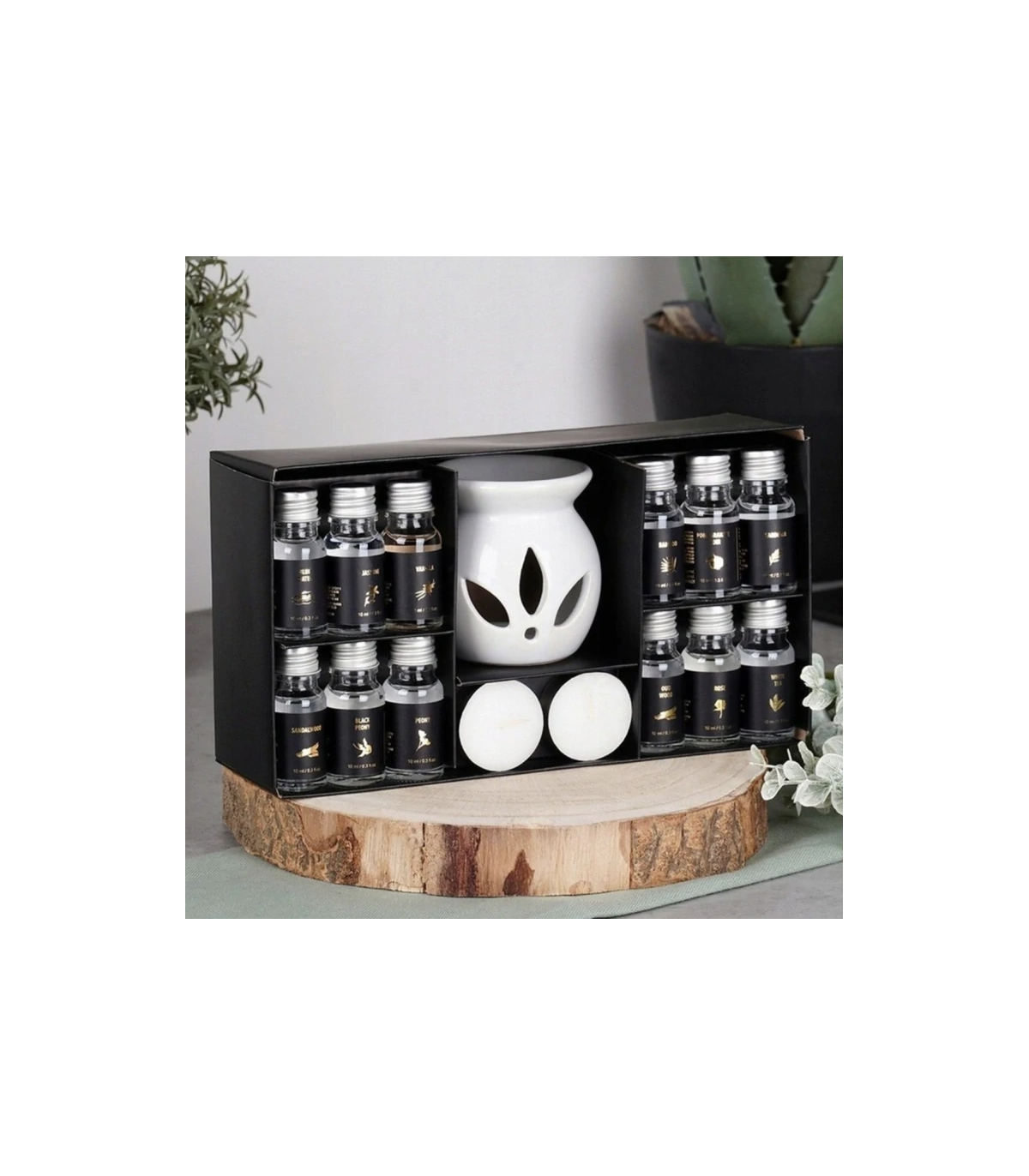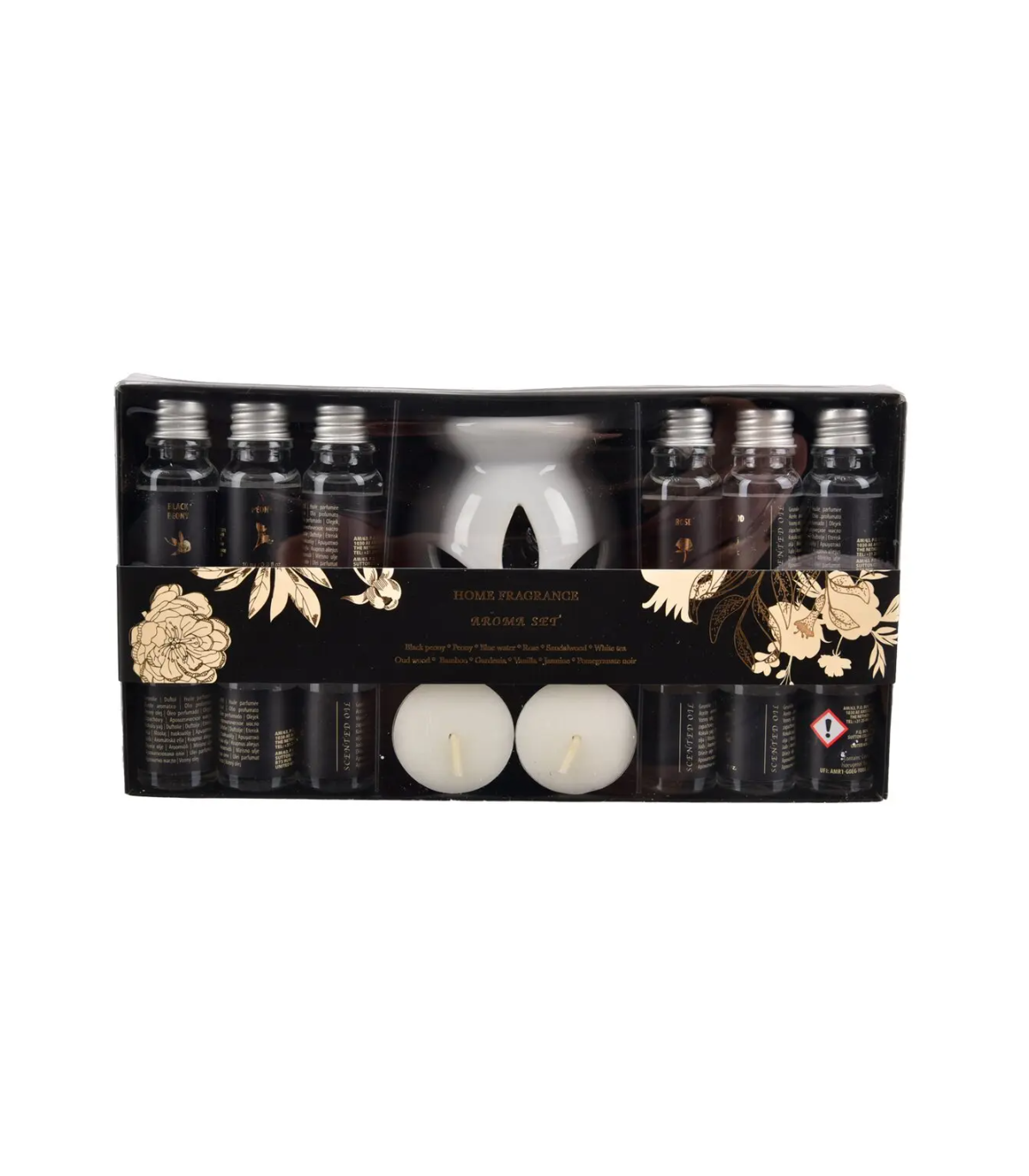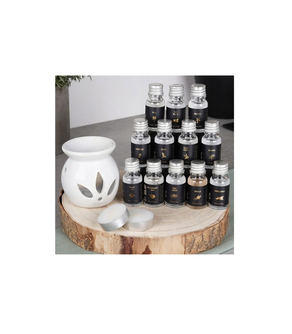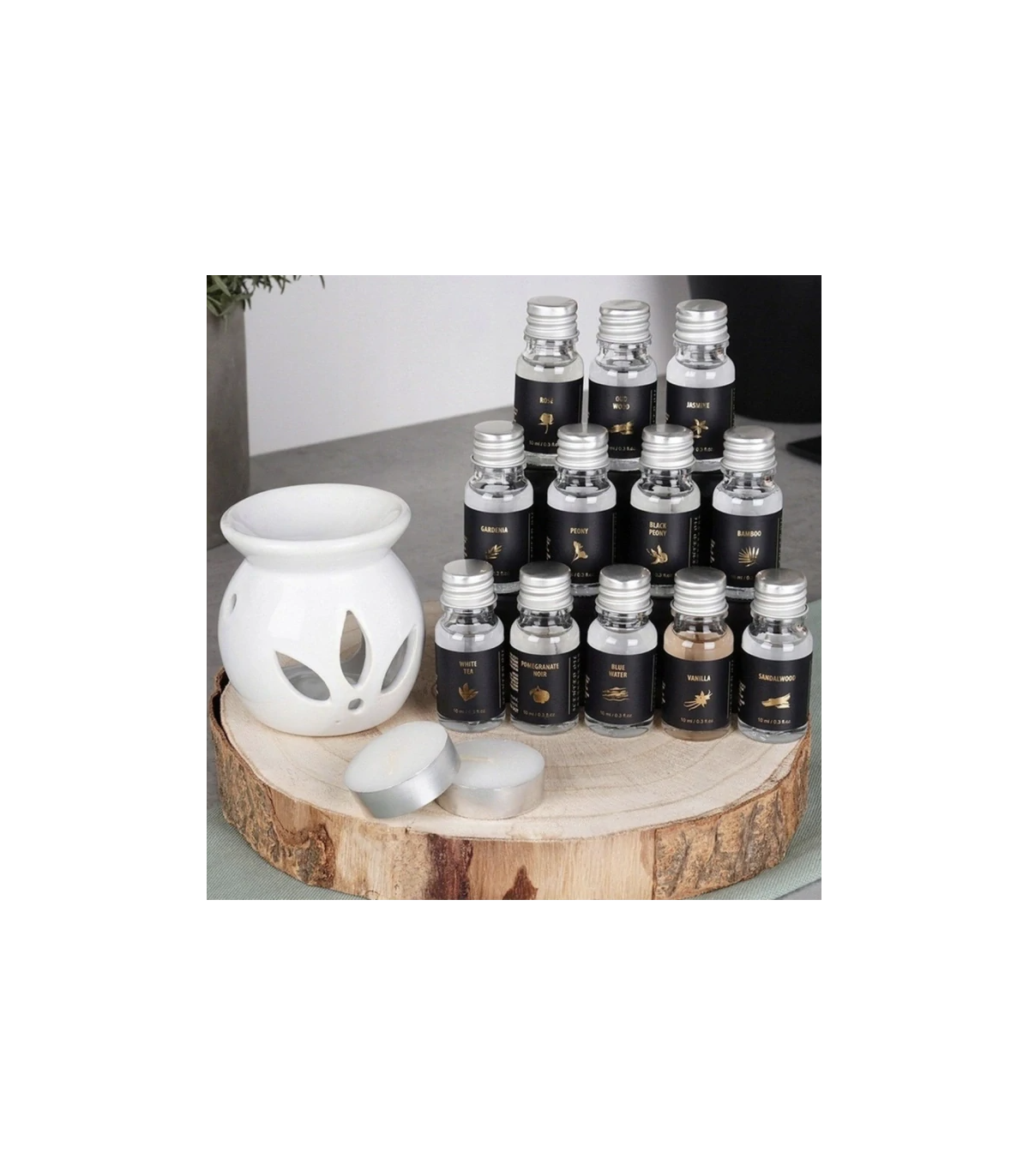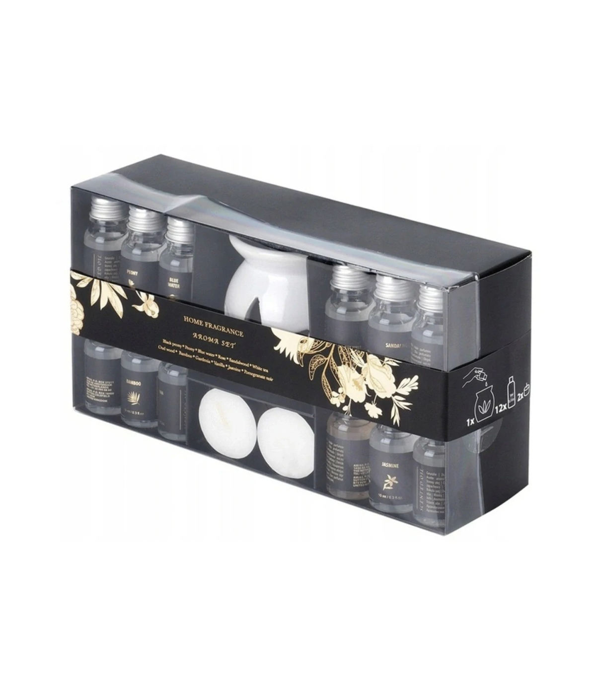 12× esenciálny vonný olej s objemom 10 ml (arómy: čierna pivonka, granátové jablko, bambus, vanilka, biely čaj, ruža, pivonka, santalové drevo, gardénia, jazmín, oud wood – staré drevo, blue water – čistá vôňa)