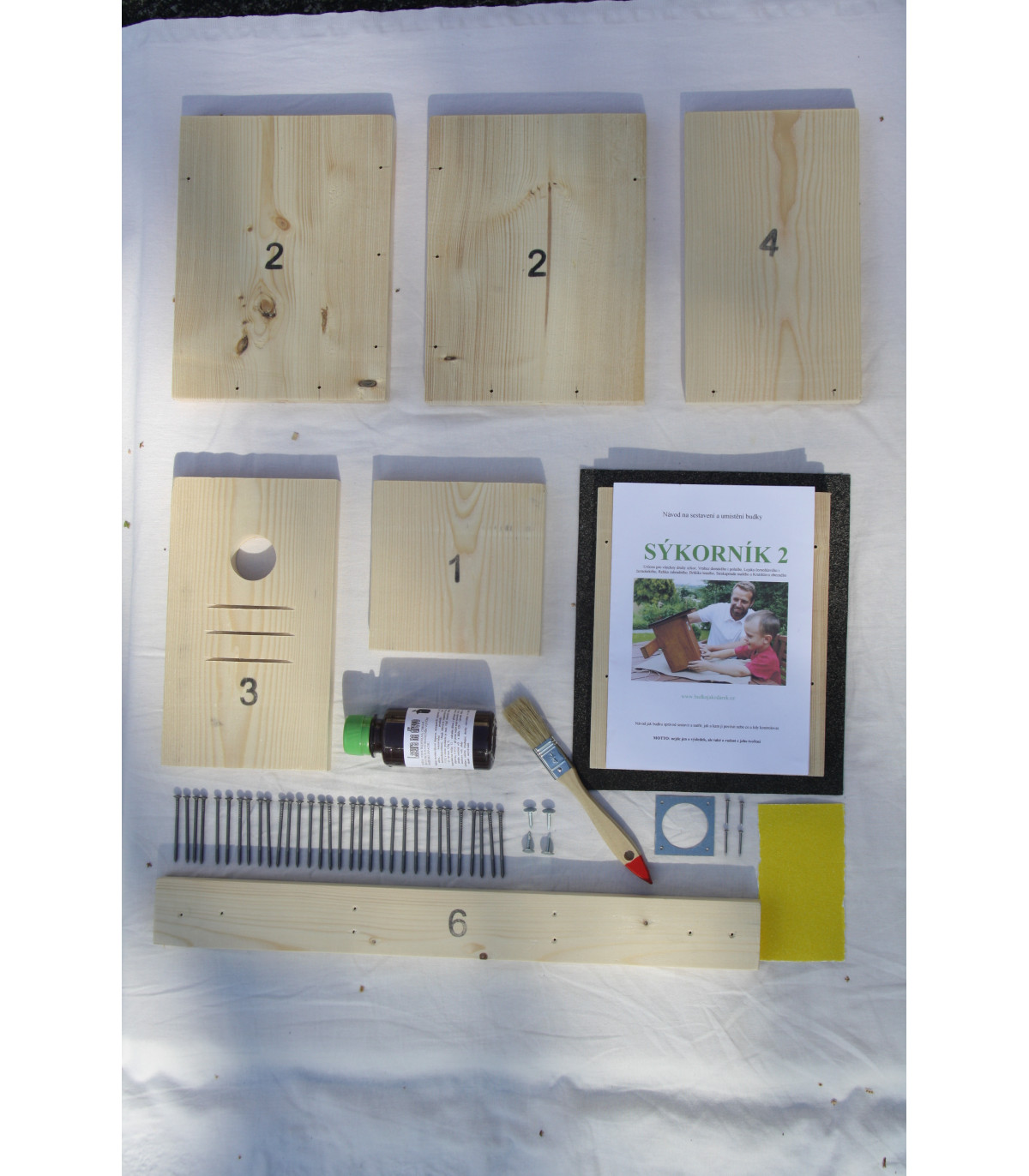 Balíček obsahuje: jednotlivé diely búdky, 3 druhy klincov, lepenka na strechu, ochrana vletového otvoru z pozinkovaného plechu, štetec, 100ml impregnácie na drevo a podrobný návod ako búdku správne zostaviť a natrieť, ako a kam ji zavesiť alebo čo a kedy neskôr kontrolovať. Stavebnica je pre prepravu zabalená v jutovom vreci, ktorý sa dá i ďalej využiť.