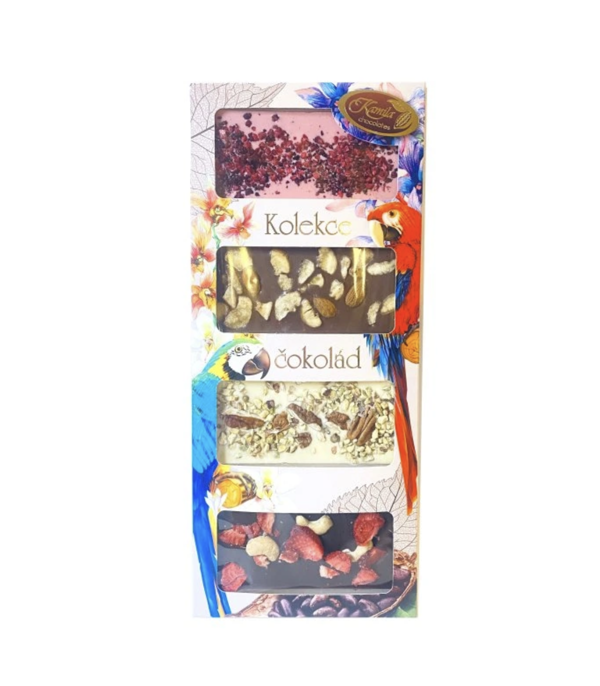 Potešte svojich blízkych lahodným darčekom, ktorý nikdy nesklame. V elegantnom balení nájdete štyri tabuľky čokolády – horkú, mliečnu, bielu a jahodovú – každú zdobenú výberom orechov a sušeného ovocia. Lieskové oriešky, kešu, pistácie, mandle, brusnice, pekanové orechy a chrumkavé lyofilizované maliny dodávajú čokoládám jedinečný vzhľad aj chuť.